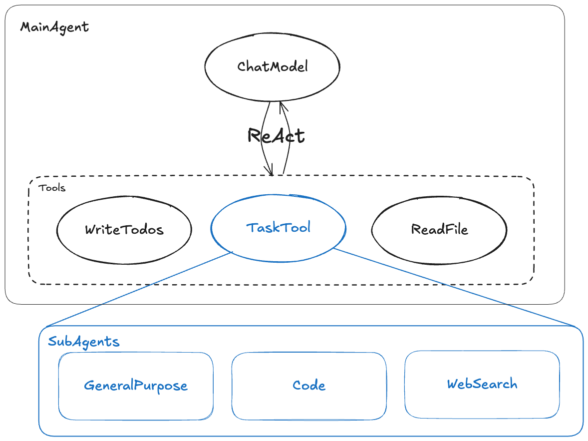 The core concept of DeepAgents is to use a main agent (MainAgent) to coordinate, plan, delegate, or autonomously execute tasks. The main agent uses its built-in ChatModel and a series of tools to interact with the external world or decompose complex tasks to specialized sub-agents (SubAgents).