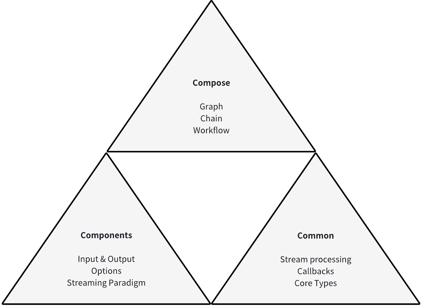 Building on clear component definitions, we believe that LLM application development has universal foundational capabilities, including but not limited to: streaming programming capabilities for handling model output; Callback capabilities for supporting aspect functionality and exposing internal component state; option extension capabilities beyond the component interface definition scope for specific implementations.
